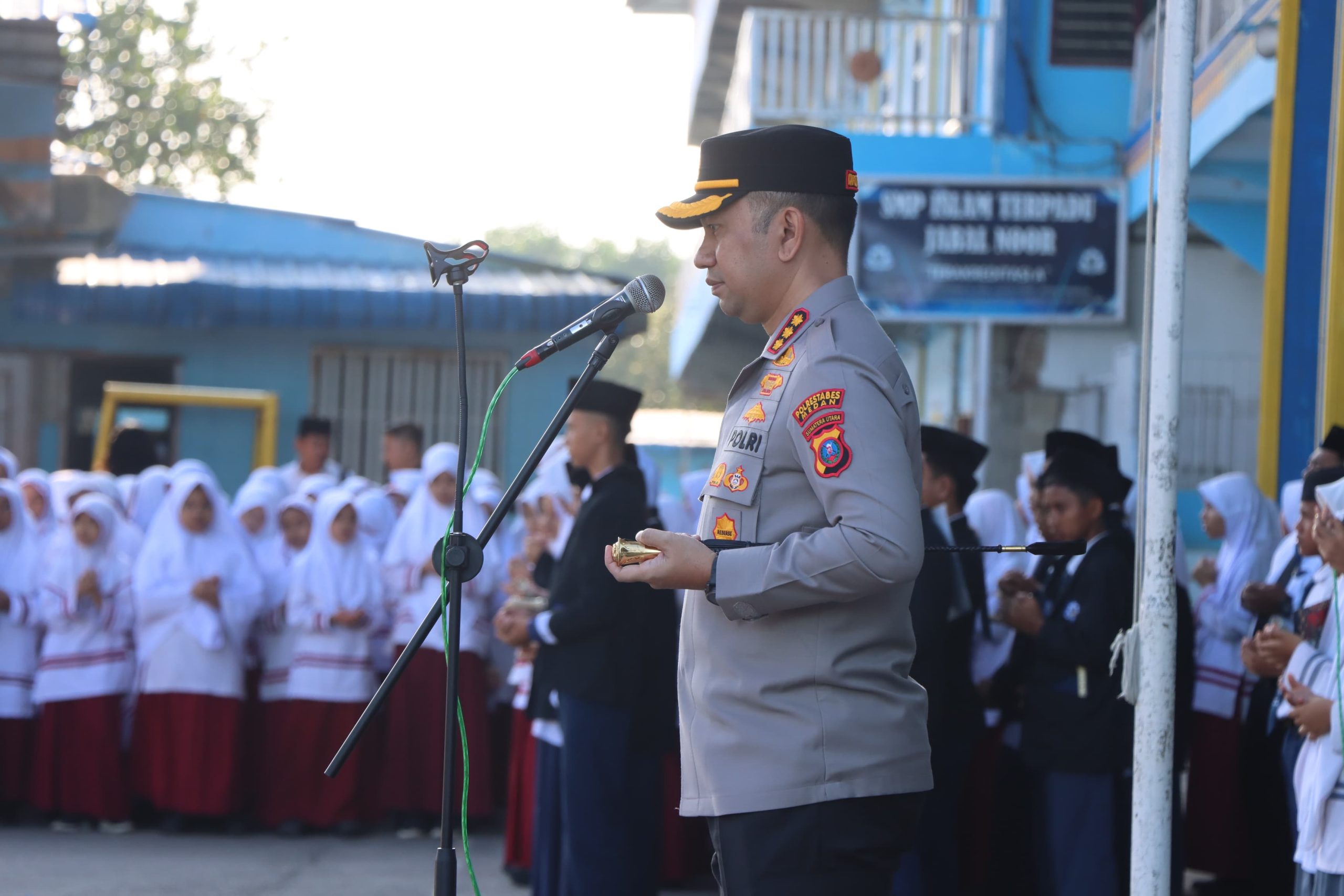 Kapolrestabes Medan Kombes Pol Dr. Jean Calvijn Simanjuntak, S.I.K., M.H., memimpin upacara bendera di Yayasan Jabal Noor, Jalan Sei Mencirim, Desa Medan Krio, Kecamatan Sunggal, Kabupaten Deli Serdang, Senin (27/10/2025) pukul 07.30 WIB. Dalam kegiatan itu, Kapolrestabes menyampaikan pesan moral kepada para pelajar agar menjauhi narkoba, menghindari perundungan (bullying), dan menumbuhkan karakter berintegritas.