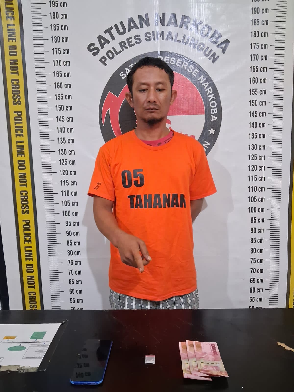 Pelaku diketahui bernama Jumali alias Jabal (40), warga Huta V Urung 01 Nagori Karang Bangun, Kecamatan Siantar. Dari tangannya disita satu plastik klip kecil berisi sabu seberat 0,19 gram bruto, uang tunai Rp300.000, dan satu unit handphone Realme warna biru.