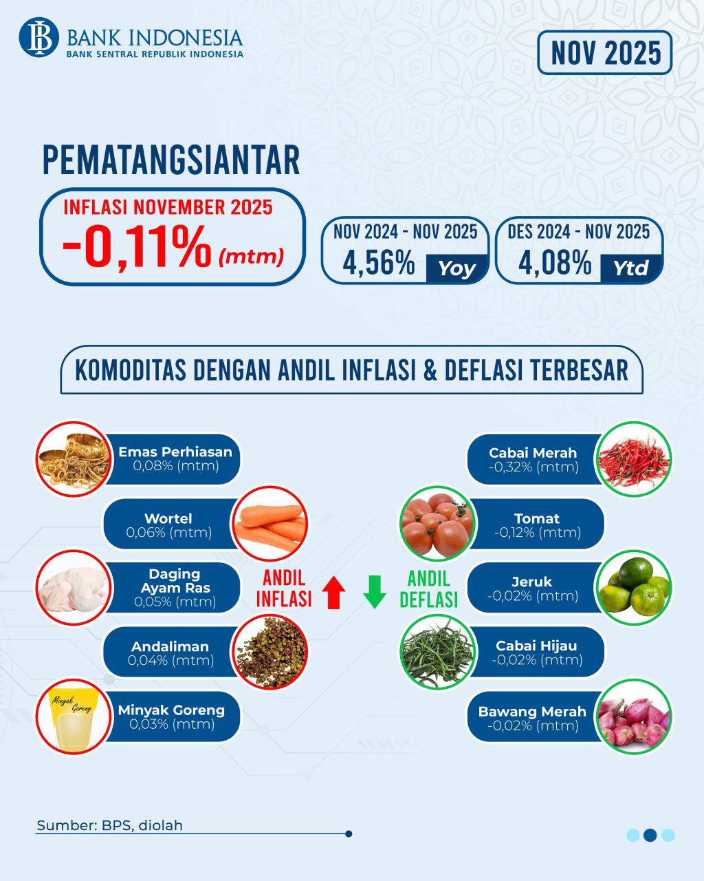 Deflasi yang terjadi pada November 2025 didorong oleh penurunan pada komoditas volatile food, terutama cabai merah yang masih mengalami normalisasi harga pasca gangguan pasokan yang terjadi pada pertengahan tahun 2025. Meskipun demikian, masih tingginya harga emas dan kenaikan pada beberapa komoditas volatile food lainnya menahan laju deflasi.