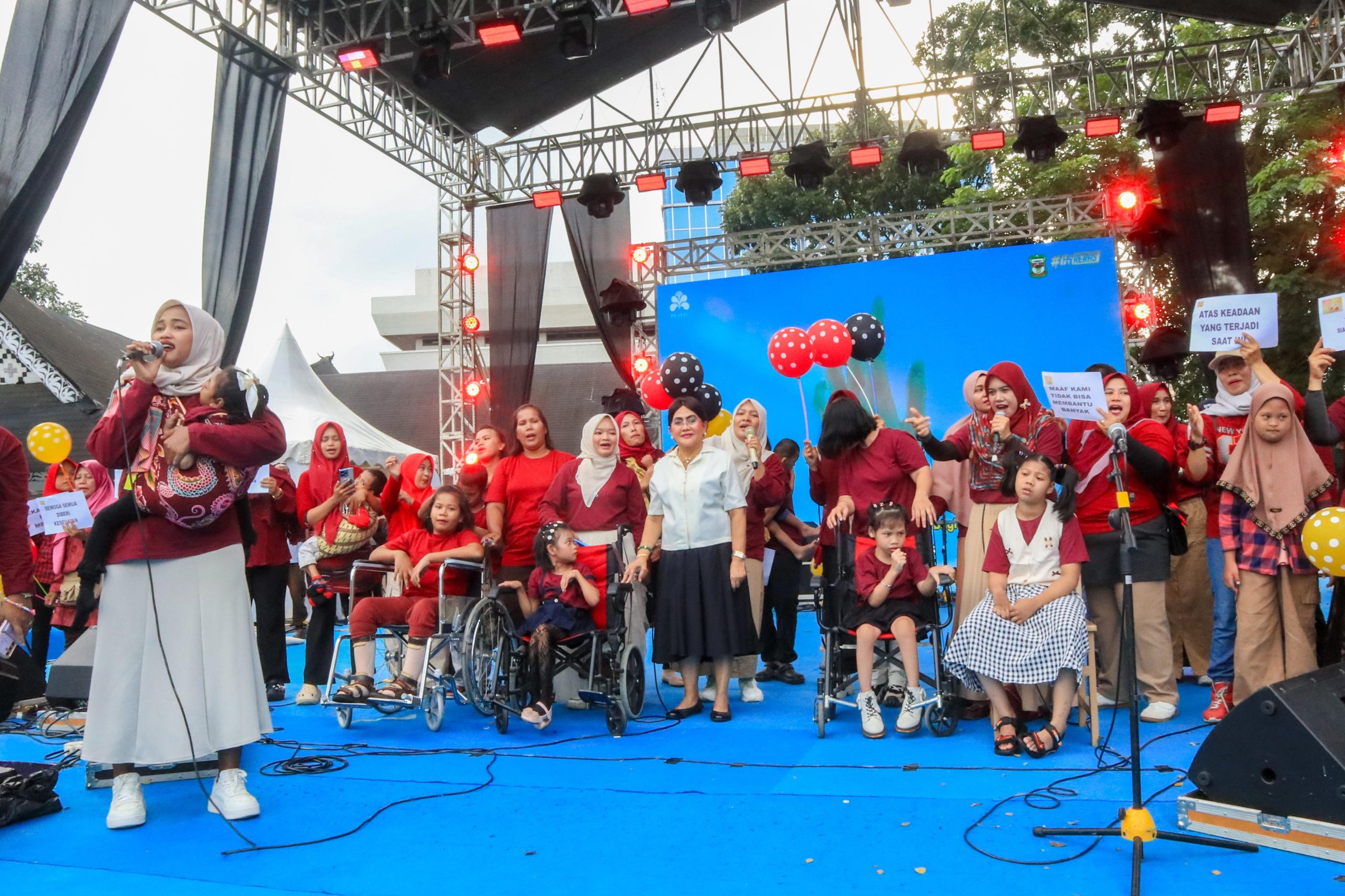 Saat menyaksikan penampilan anak-anak RRABK, Ny Liswati ikut membersamai mereka di area panggung. Ia menyapa, menyalami satu per satu anak-anak serta para orang tua yang mendampingi, memberikan dukungan secara langsung.