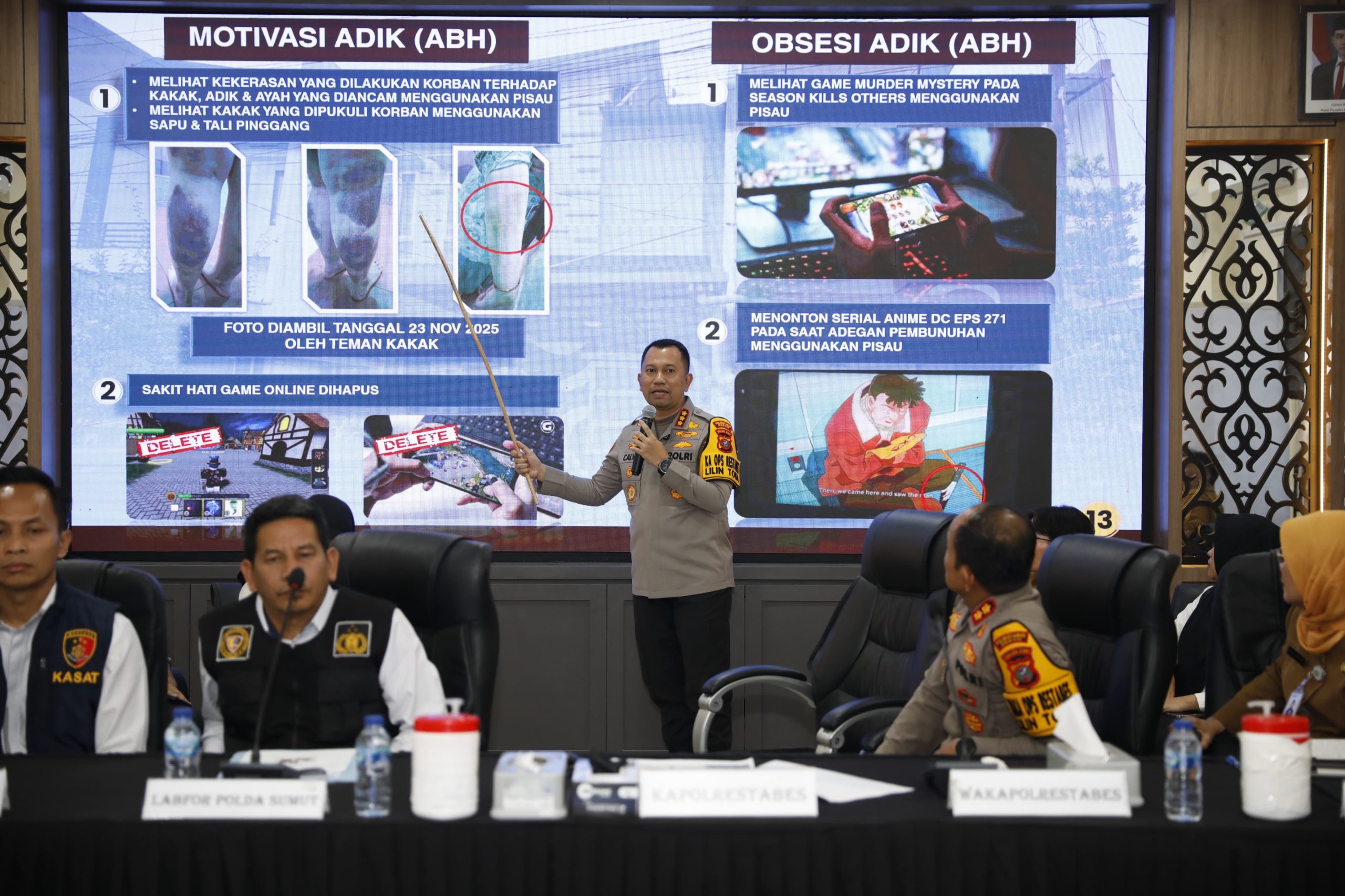 Polrestabes Medan menggelar konferensi pers terkait kasus meninggalnya seorang ibu rumah tangga berinisial F (42), yang diduga dibunuh oleh anak kandungnya yang berstatus anak berhadapan dengan hukum (ABH), AL (12), di Kota Medan. Konferensi pers dipimpin langsung Kapolrestabes Medan Kombes Pol Calvijn Simanjuntak, Senin (29/12/2025).