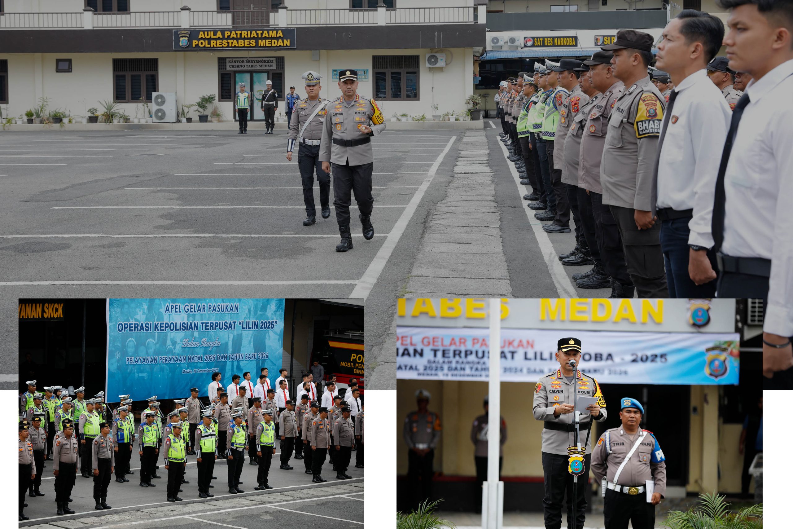 Polrestabes Medan menggelar Apel Gelar Pasukan Operasi Kepolisian Terpusat “Lilin Toba 2025” dalam rangka pengamanan dan pelayanan perayaan Natal 2025 serta Tahun Baru 2026, Jumat (19/12/2025) sore. Kegiatan berlangsung di Lapangan Apel Polrestabes Medan dan dipimpin langsung oleh Kapolrestabes Medan Kombes Pol Dr Jean Calvijn Simanjuntak, S.I.K., M.H.