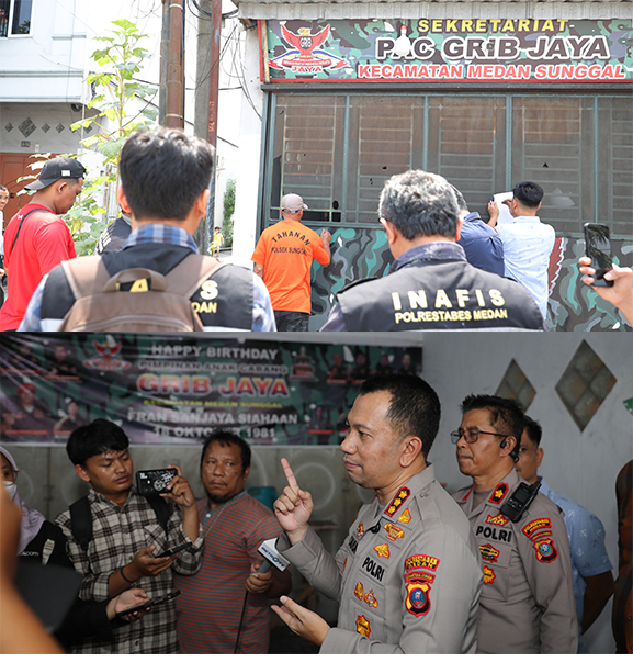 Polrestabes Medan bersama Polsek Sunggal menggelar pra-rekonstruksi pengungkapan kasus tindak pidana perjudian di Sekretariat PAC Grib Jaya, Jalan Tapian Nauli, Kecamatan Medan Sunggal, Kamis (29/1/2026). Kapolrestabes Medan Kombes Pol Dr. Jean Calvijn Simanjuntak menegaskan empat tersangka telah diamankan, sementara dua orang lainnya berstatus DPO, yakni FS dan istrinya EA, yang berperan sebagai perekrut dan pengelola keuntungan harian.