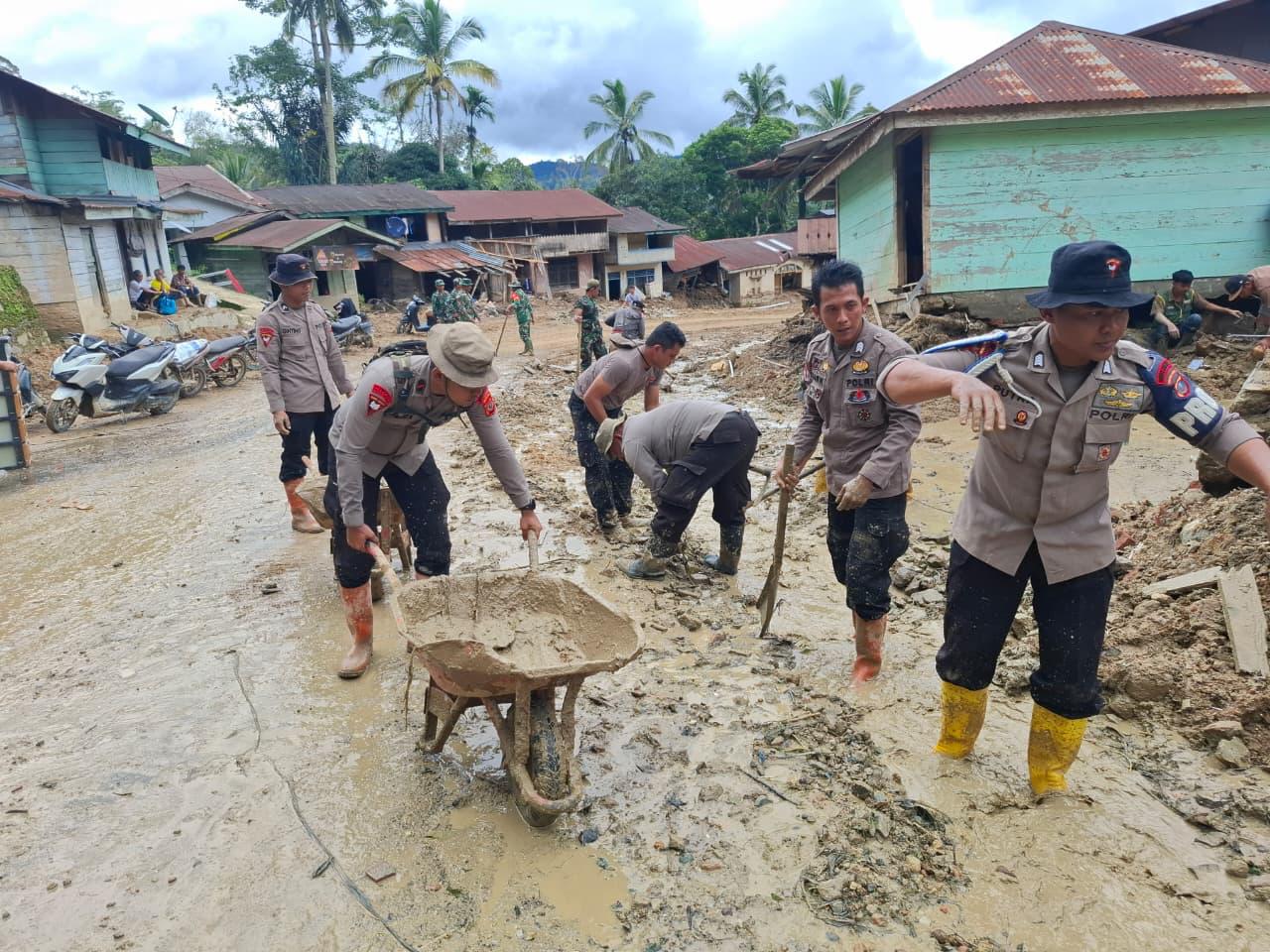 Dipimpin oleh Wadanyon C Pelopor, Kompol Sarijo, S.Pd., M.H., bersama Danki 1, AKP M. Syafril Sinaga, S.H., personel Brimob terjun langsung membantu warga terdampak longsor di Desa Pengkolan.