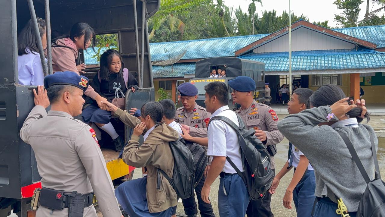 Dengan penuh keikhlasan, personel Brimob mengantar para pelajar dari Desa Ononamolo menuju Desa Miga, Kepulauan Nias, memastikan setiap anak tiba dengan aman di rumah mereka masing-masing.